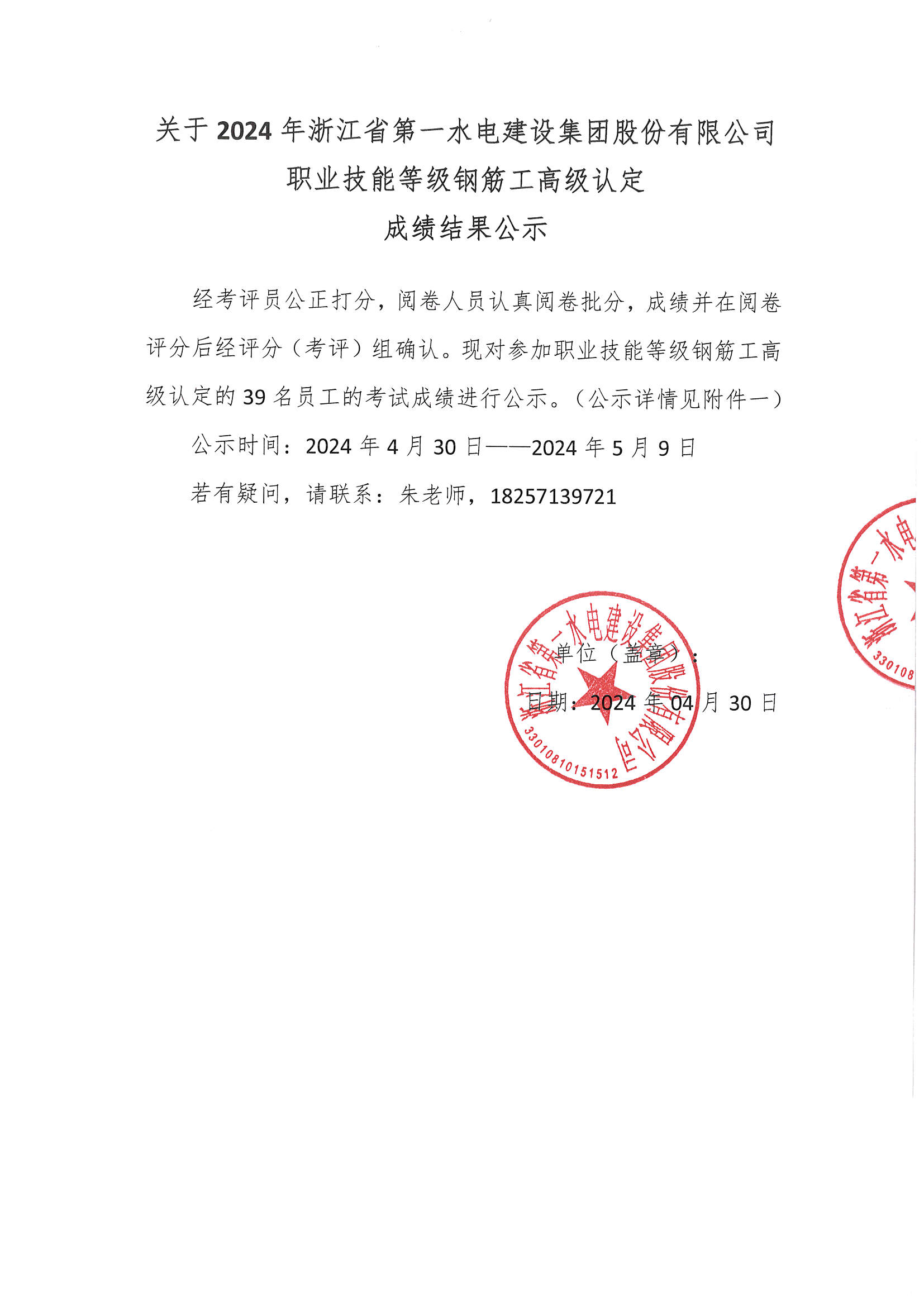 關于 2024 年浙江省第一水電建設集團股份有限公司職業(yè)技能等級鋼筋工高級認定成績結果公示